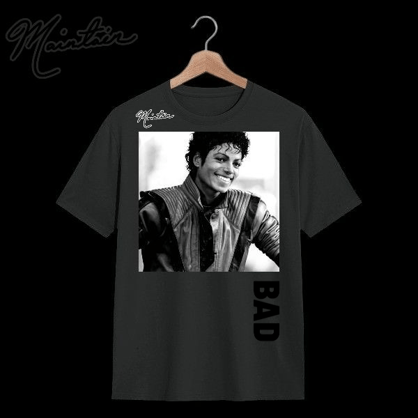 Black tee image of Michael Jackson with logo maintain in top right corner & BAD on bottom left corner